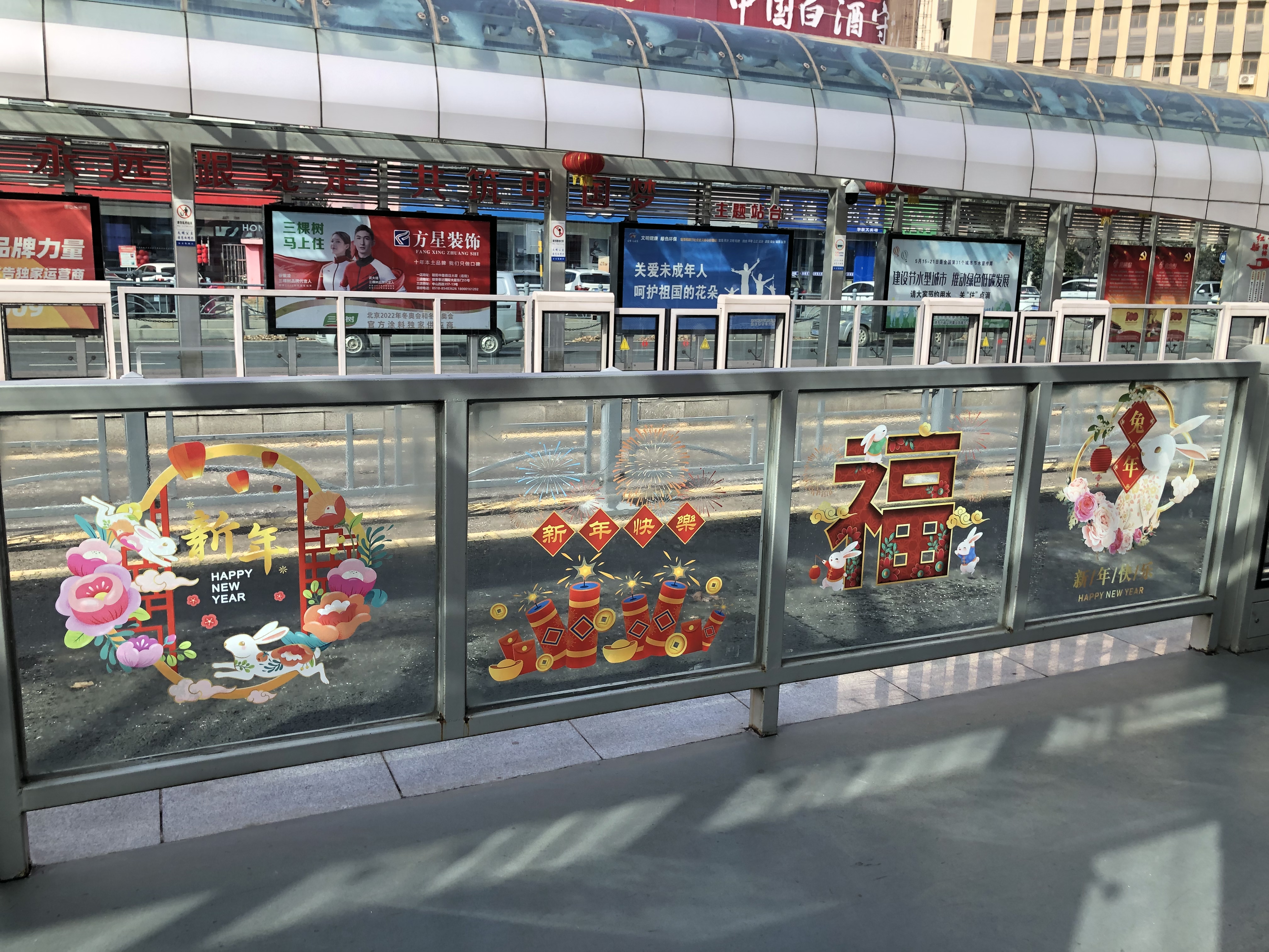 站臺換上節日的盛裝,走進站臺魚頭處,首先兌幣機亞克力板上張貼的兔年大吉映入眼簾,從進站口到閘機處地面上貼有“迎新春、過大年”的腳丫貼紙,站房頂部四周貼上紅色打底、燙金福字的拉花,走進站臺內,安全門旁的玻璃上貼有2023新年快樂、兔年快樂、福字、鞭炮、燈籠等13個具有新年感的玻璃靜電貼。這次主題站臺的裝飾,將傳統與現代相結合,讓每一位市民乘客在乘坐BRT時感受到濃濃的年味。經常乘車的王女士說:“BRT站臺裝扮的太漂亮了,感受到了新年的味道,也祝BRT2023年越來越好!”