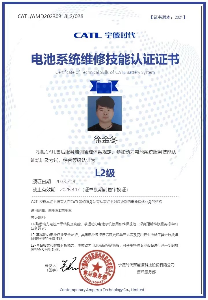 此次培訓(xùn)選派張強(qiáng)、徐金冬兩名一線維修人員參加寧德時(shí)代在武漢舉辦的《鋰動(dòng)力電池》L2-A培訓(xùn),培訓(xùn)分為理論和實(shí)操,理論課內(nèi)容涉及認(rèn)識(shí)商用車電池系統(tǒng)、電池均衡;實(shí)操課涵蓋了商用車上位機(jī)使用、安全作業(yè)防護(hù)與基本維修流程、充放電作業(yè)、商用車電池箱深度拆裝等重點(diǎn)內(nèi)容,參培人員利用5天的時(shí)間,參加培訓(xùn)的人員認(rèn)真學(xué)習(xí),在實(shí)操訓(xùn)練中逐步熟悉和掌握電池拆裝及使用專業(yè)維修工具進(jìn)行故障排查處理的維修技能,最終通過(guò)理論、實(shí)操考核工作,獲得了寧德時(shí)代頒發(fā)的L2級(jí)維修技能等級(jí)證書(shū)。