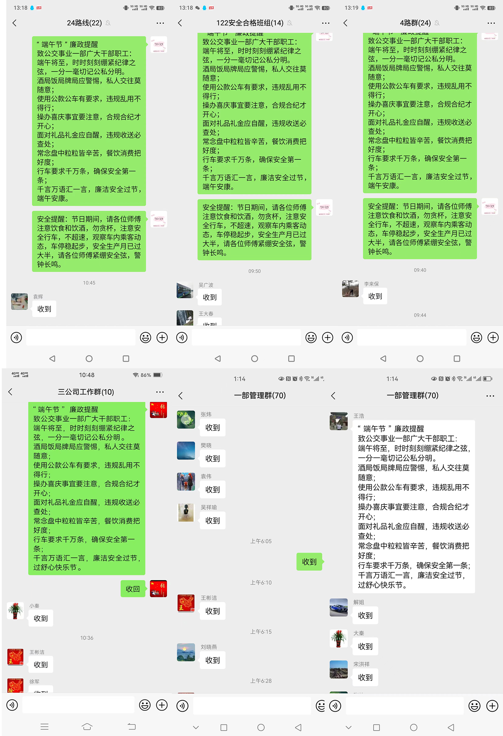 傳“廉”意,在警示提醒中筑牢思想防線。為筑牢廉政風險“防火墻”,公交事業一部采用群發微信工作群的方式,向所屬職工發送廉政微信,溫馨提醒中實現“廉政微信一條,警示教育一片”的良好效果。同時結合廉政文化向八小時以外延伸,向社會和家庭延伸,向黨員干部職工及轉發家屬形式開展廉政警示教育,引導干部職工家屬當好“廉內助”,常吹家庭“廉政風”,念好家庭“廉政經”,算好家庭“廉政賬”。