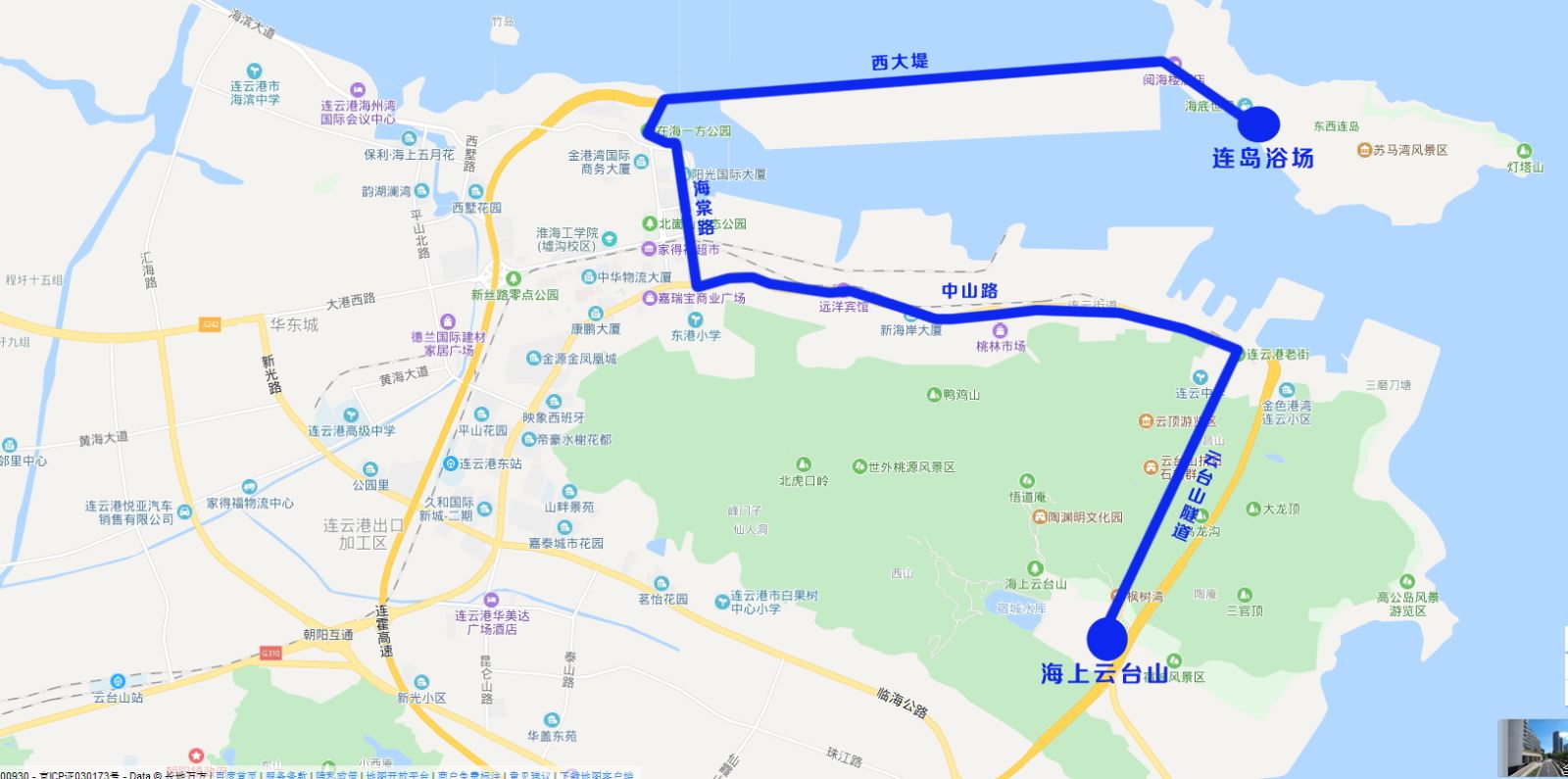 1、線路走向:海上云臺山—云臺山隧道—中山東路—海濱大道—西大堤—連島北路—連島浴場