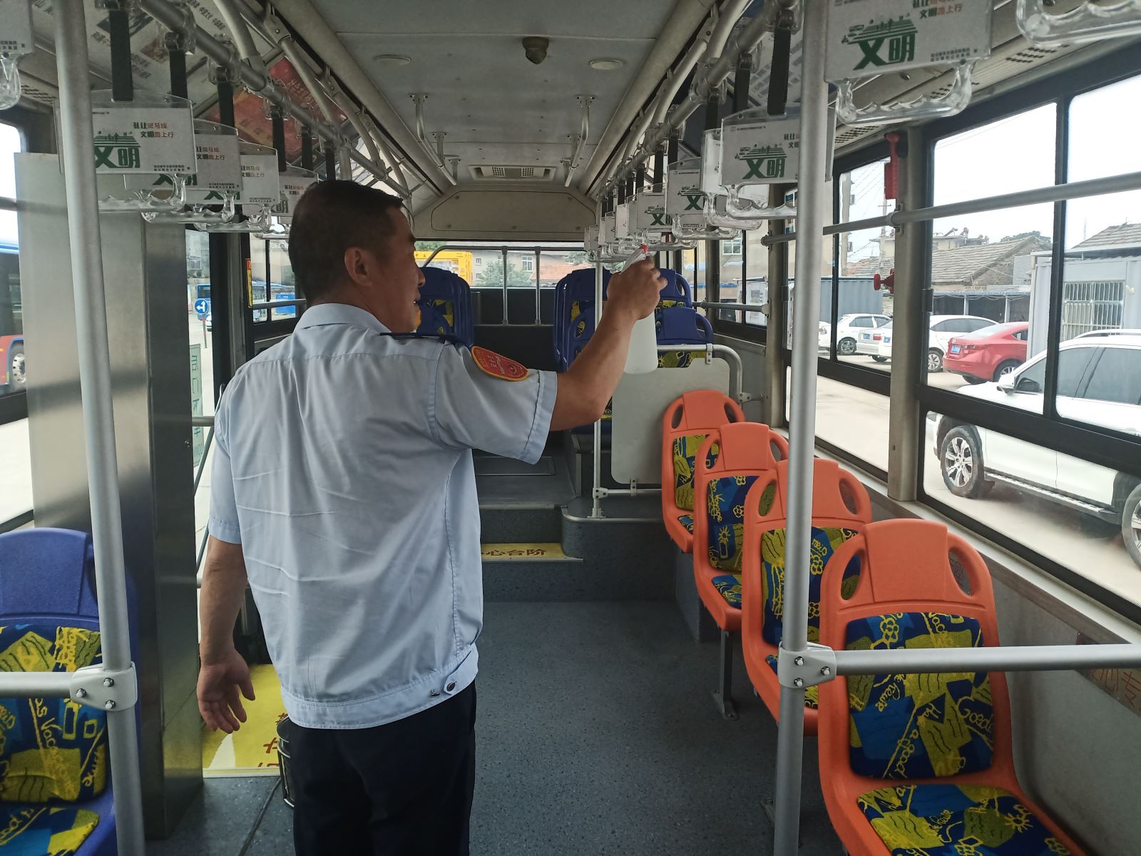 為了給乘客營造一個干凈、健康的乘車環境,駕駛員在第一時間為愛車“清洗”,首先利用洗車機將車身外部清洗干凈,然后對車廂內部進行打掃,擦拭駕駛室內的衛生死角,拖地板、擦玻璃、座椅、扶手等。為確保疫情期間做好防控工作,還要對車內進行消毒,并打開門窗通風透氣。